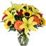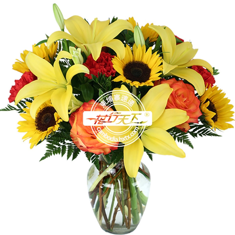 描述: 向日葵、百合、玫瑰组成、玻璃花瓶装。