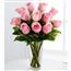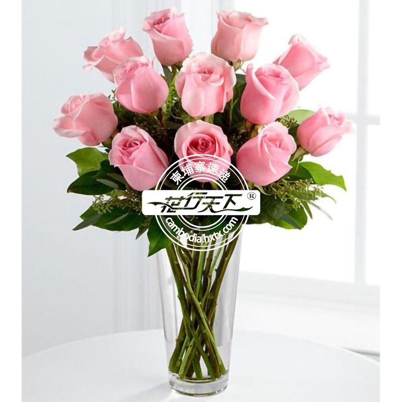 描述: 12枝粉色玫瑰组成、玻璃花瓶装。