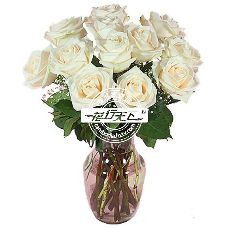 描述: 12枝白色玫瑰组成、玻璃花瓶装。