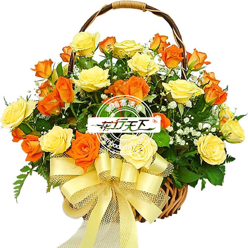 描述: 黄色与橙色玫瑰组成、精美花篮装。